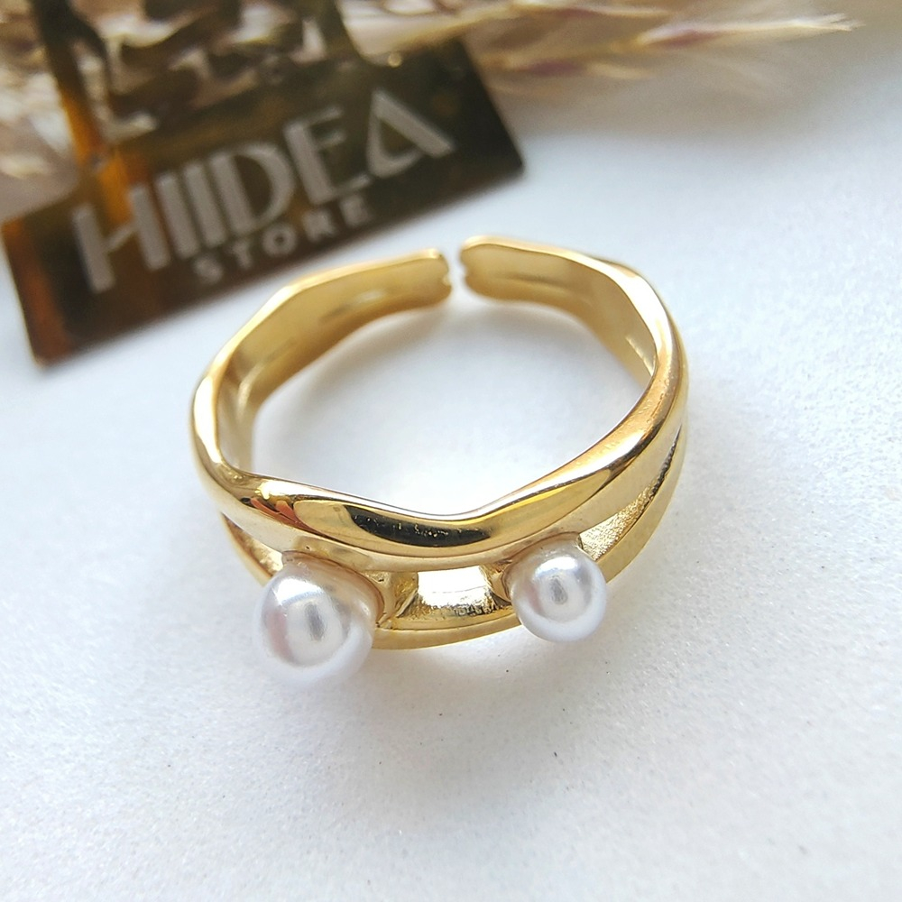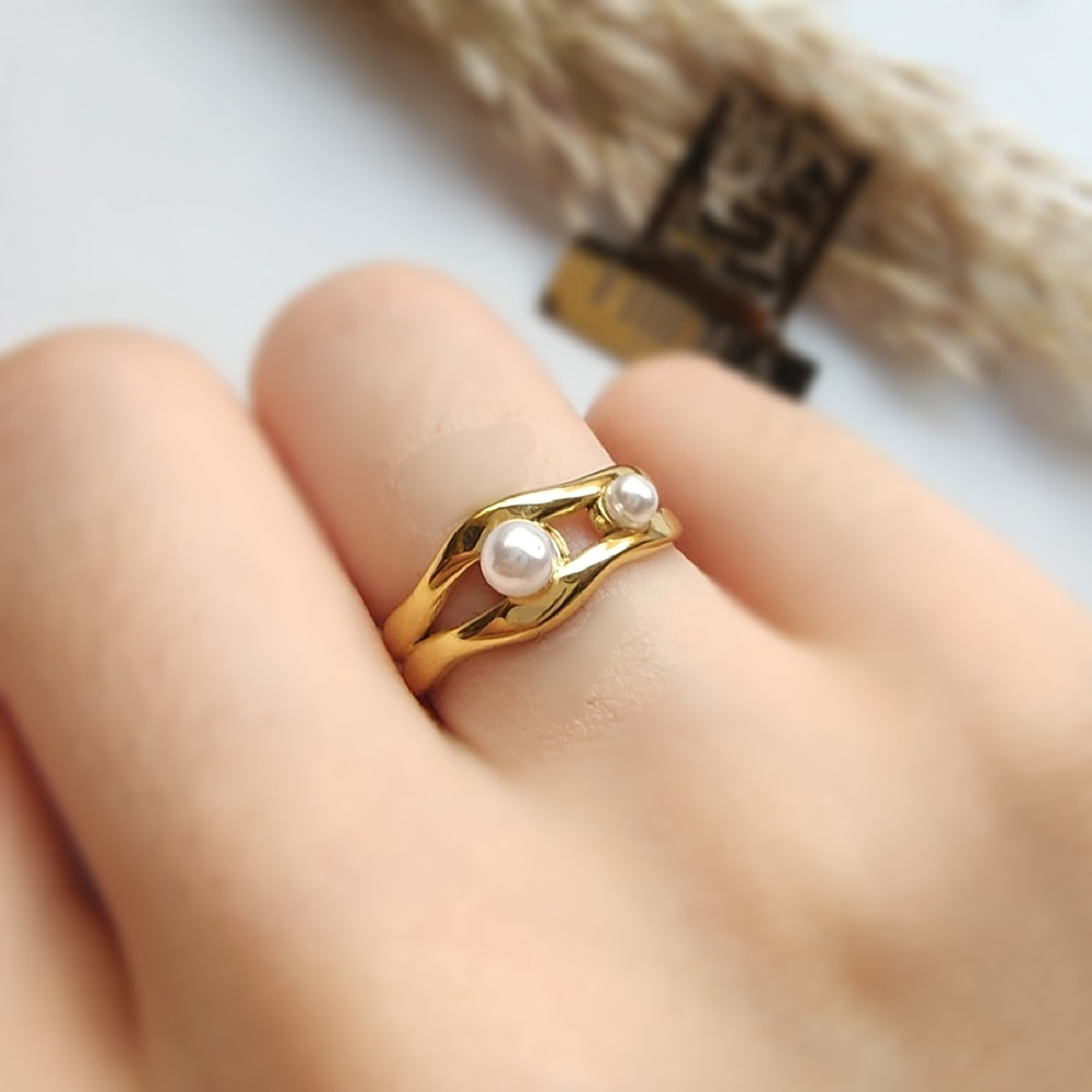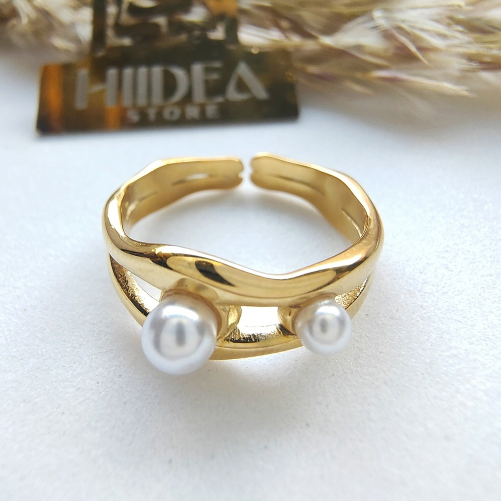 (الصورة حقيقية بدون تعديلات) خاتم ستانلس ترندي  مفتوح مرصع  باللولي عالي الجودة مصنع من الاستانلس البيور عالي الجودة المعالج ضد الصدأ + طلاء بجودة عالية