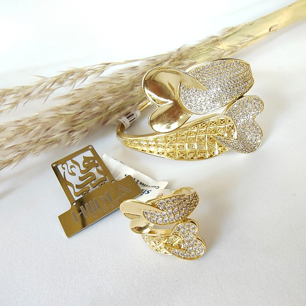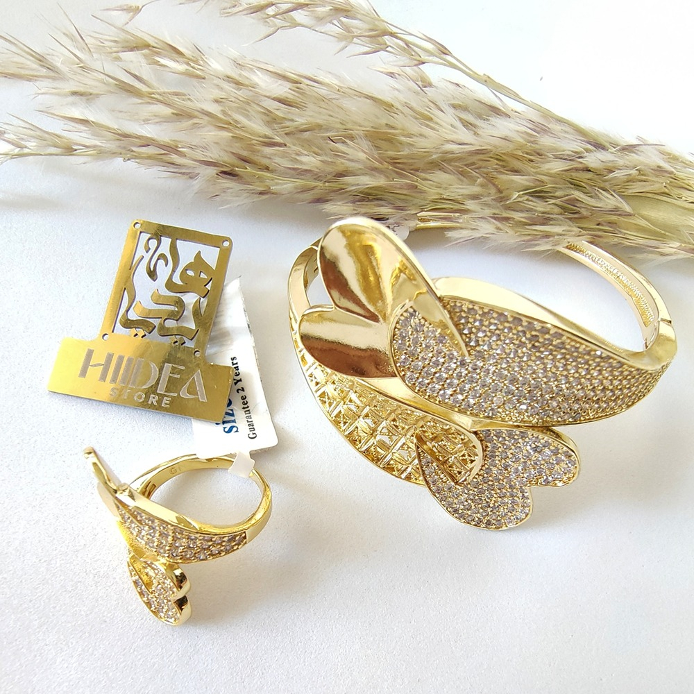 (الصورة حقيقية بدون تعديلات) اسورة + خاتم قلوب ذهب صيني عالي الجودة مرصع بفصوص الزركون عالية الدقة + طلاء ذهب عيار18 .