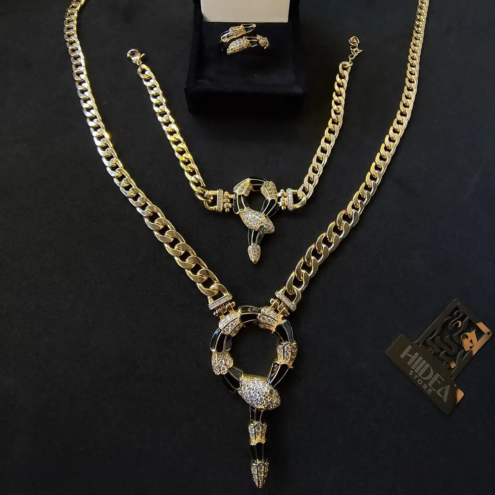 (الصورة حقيقية بدون تعديلات) طقم ذهب صيني ثعبان كرتيير عالي الجودة مكون من (سلسلة + انسيال +خاتم) مرصع بفصوص الزركون عالية الدقة + طلاء ذهب عيار 18.