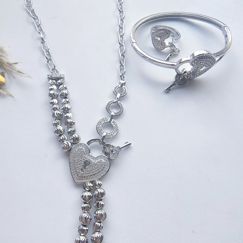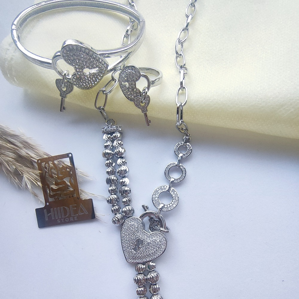(الصورة حقيقية بدون تعديلات) طقم ذهب ابيض صيني قلب باللون السيلفر عالي الجودة مكون من (سلسلة + انسيال +خاتم) مرصع بفصوص الزركون عالية الدقة + طلاء ذهب عيار18 .
