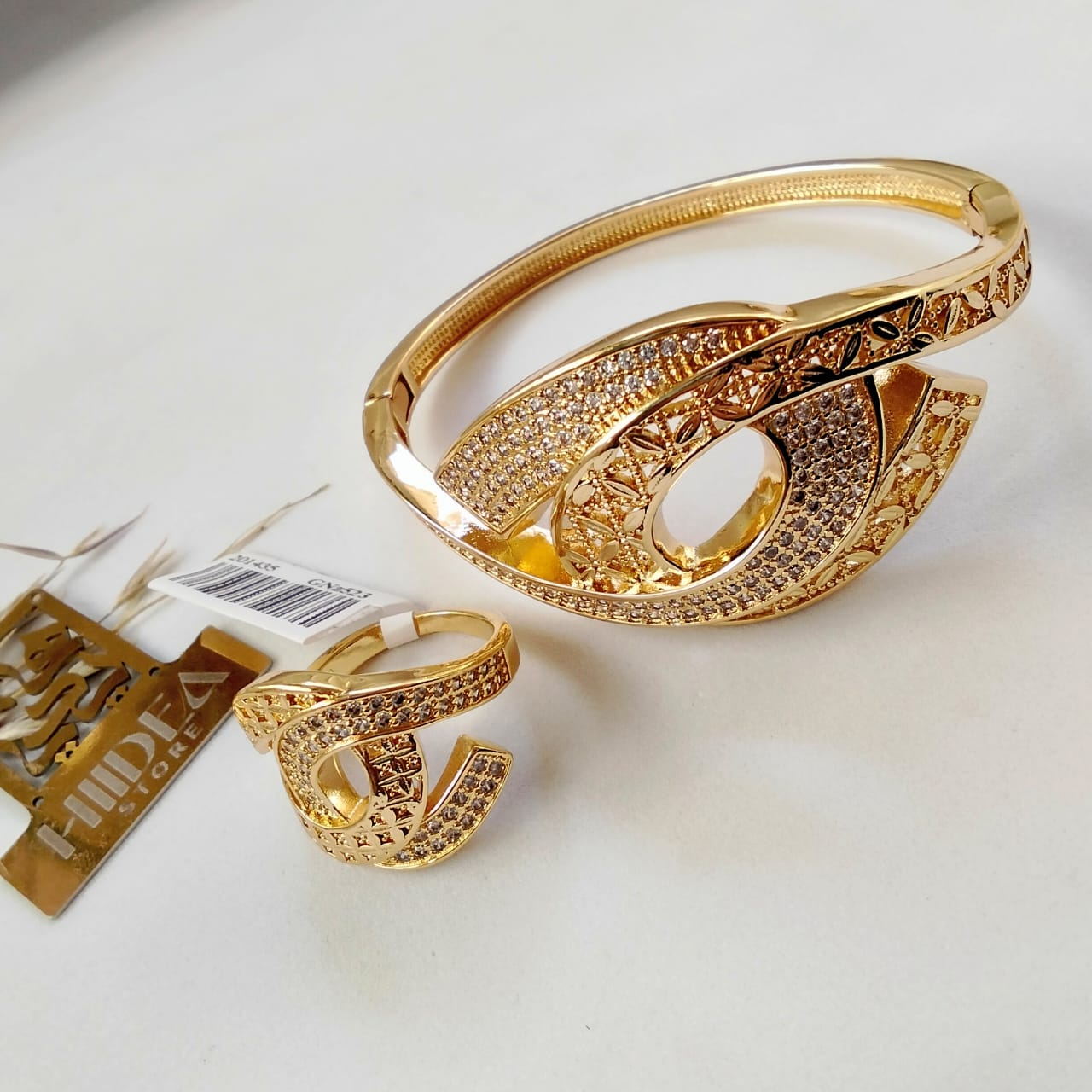 (الصورة حقيقية بدون تعديلات) اسورة + خاتم ذهب صيني عالي الجودة مرصع بفصوص الزركون عالية الدقة + طلاء ذهب عيار18 .